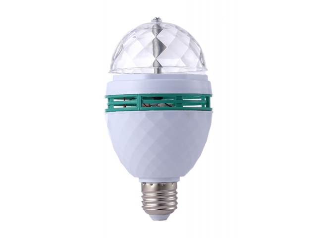 Kolorowa żarówka dyskotekowa zasilana z sieci elektrycznej. Pasuje do standardowego, dużego gwintu żarówkowego E27. Wyposażona w energooszczędne diody LED o niskim poborze mocy (jedynie 3W). Imitują kolorowe światło RGB, zaś nieregularny kształt kopułki zapewnia fantastyczne efekty świetlne szczególnie w zaciemnionych pomieszczeniach.