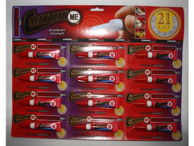 Oryginalny klej Cyjanopan ME do połączeń sztywnych. Do szybkiego łączenia metali, gum, porcelany, tworzyw sztucznych i niektórych gatunków drewna. Paletka 12 szt.